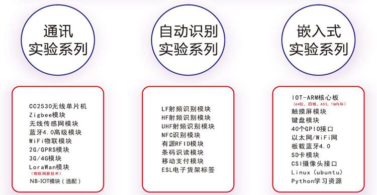 实验模块涵盖传感技术、嵌入式技术、自动识别、通讯工程、自动化、电子工程、物联网工程等诸多学科的实验实训。