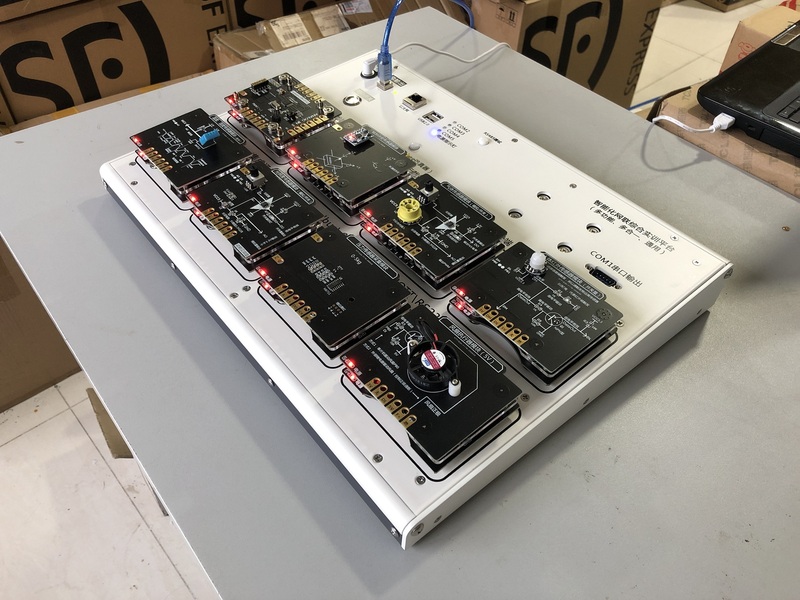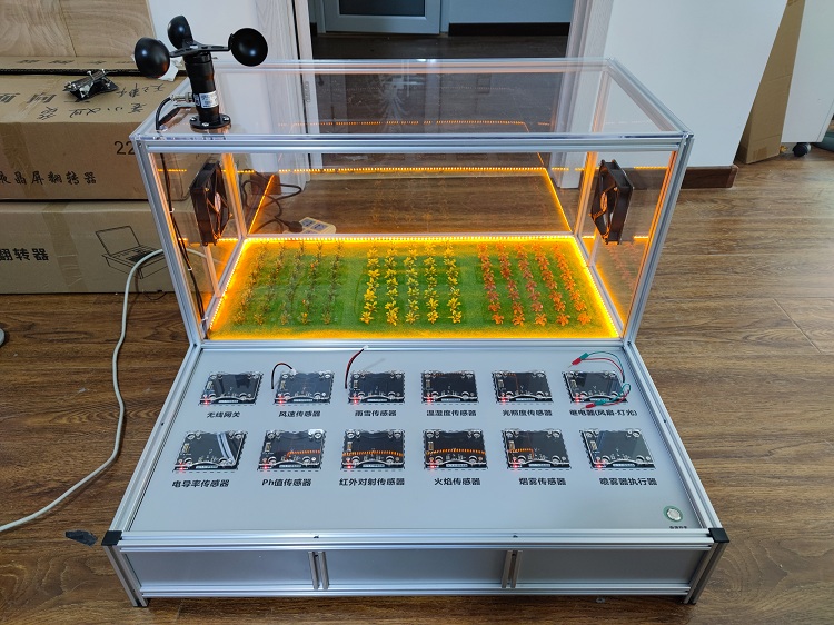 源启未来沙盘主体采用铝合金骨架,长宽高为:800*800*500mm,沙盘一侧为智能农业大棚模型,大棚内置风扇节点、灯光节点、农业传感器以及相关控制器节点,另一侧为智能农业实训区域,实训区域支持磁吸搭积木的连接方式,表面集成多路物联网模块供电底板,所有供电底板由沙盘内部统一供电,无需外接电源,便于学生操作;