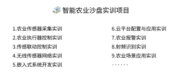 源启未来智慧农业教学实训沙盘是以农业大棚为原型,通过实景+实训的方式,综合运用无线传输网络、单片机、RFID射频识别、传感器与控制器、云计算等技术,依托部署在实景沙盘中的在农业传感器与控制器、无线网络、RFID以及智能网关等设备,实现智能农业的控制与管理,帮助学生熟悉智能农业系统相关项目的开发与应用。