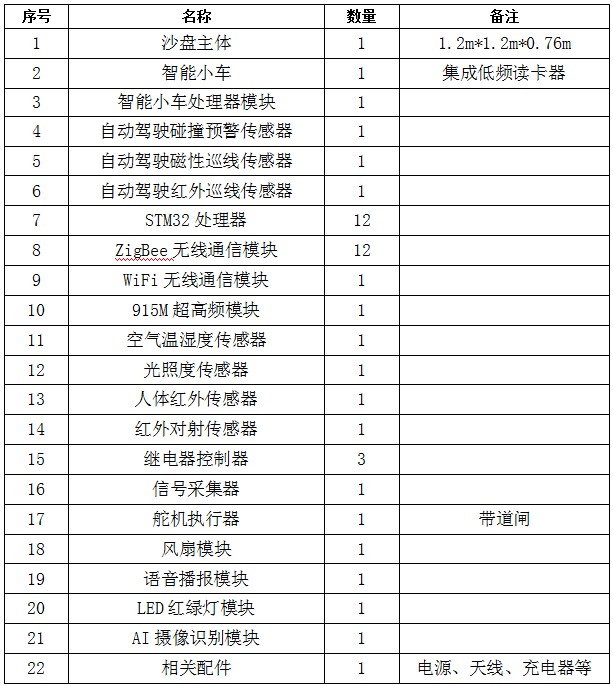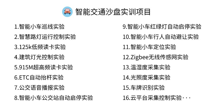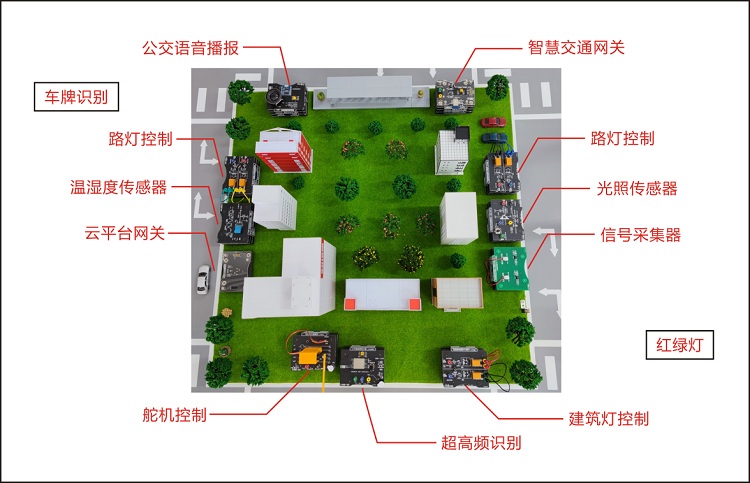 智慧交通沙盘模型为各个系统提供相应的场景,场景中布置对应功能的传感器与执行器,传感器将采集到的信息通过ZigBee进行传输,并控制相应执行器作出反应,使得智慧城市、自动驾驶、车辆追踪、ETC控制、城市环境监测、智能路灯、城市灯光控制、交通灯指示、物联网应用、物联网实训智能车、智能网关、物联网云服务器等系统融合在一起,形成一套完整的智能交通模型。