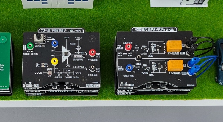 城市灯光系统由光照度传感器、继电器执行器以及内置在建筑物内的LED灯组成,当环境亮度降低时,达到预设的临界值时,建筑灯光会自动亮起,亮度恢复正常后,建筑灯光自动熄灭;