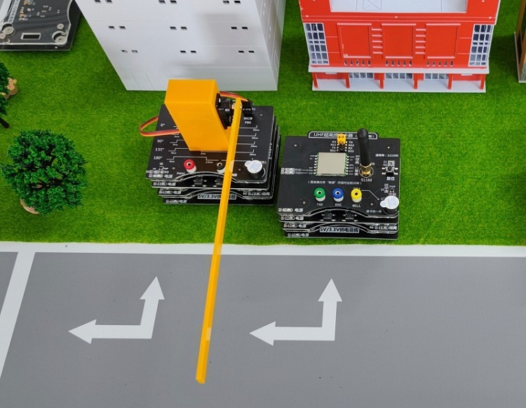 ETC不停车收费系统由915M高频读卡器和舵机执行器组成,当小车驶入ETC入口时,915M高频读卡器识别小车预设的高频卡片,并将道闸打开的指令通过ZigBee网络传输到舵机执行器,由舵机执行器完成自动抬竿,待检测到小车经过后,自动关闭道闸;