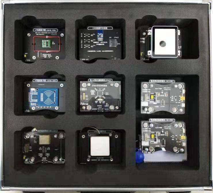 采用STM32F103处理器,采用积木式探针,可以实现对RFID模块进行控制功能。提供1个复位键,用于系统的复位。所有IO口都通过跳线针的形式引出在开发板的四周,可以方便学生进行跳线的连接方式。支持ADC、SPI、IIC、UART、PWM等接口。底部采用标准的12路弹性插针,可与调试底板模块标准连接,用于程序下载、串口调试、供电等功能。无须外部接线,磁吸形式。提供RFID模块通用接口,RFID模块接口功能可直接通过拨码开关选择切换,无需修改程序代码便可实现功能自动切换。
