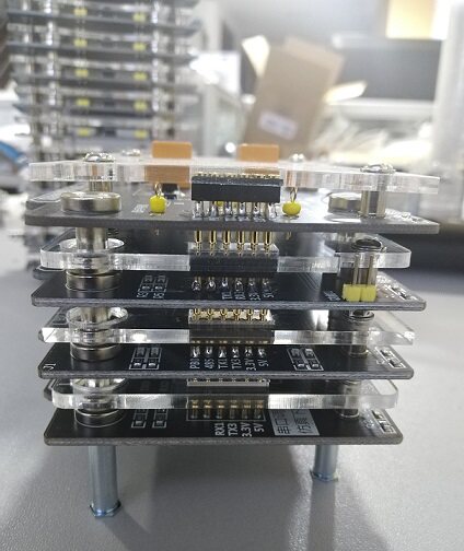 源启未来物联网实验箱所有模块采用磁吸式接口设计及搭积木式架构,采用标准的12路弹性插针,可以实现供电、仿真调试、数据通信、IO口拓展等功能;同时支持搭积木式的多级磁吸连接,无须外接跳线,通过弹性插针即可通信。即:调试底板模块+STM32处理器模块+RFID读卡器模块(LF/HF/UHF)(3层垂直积木,无须额外接线),可拓展性极强,如下图所示: