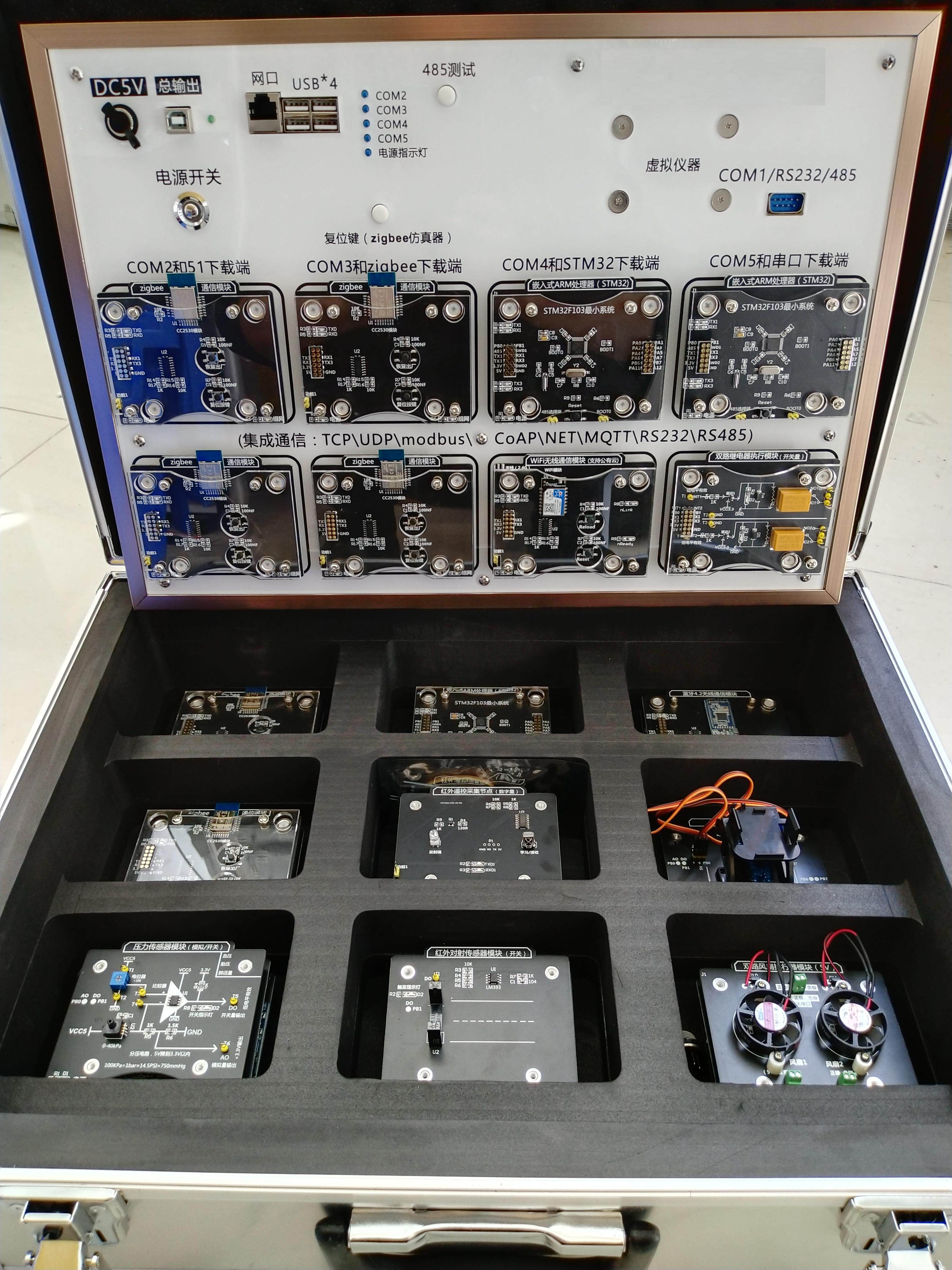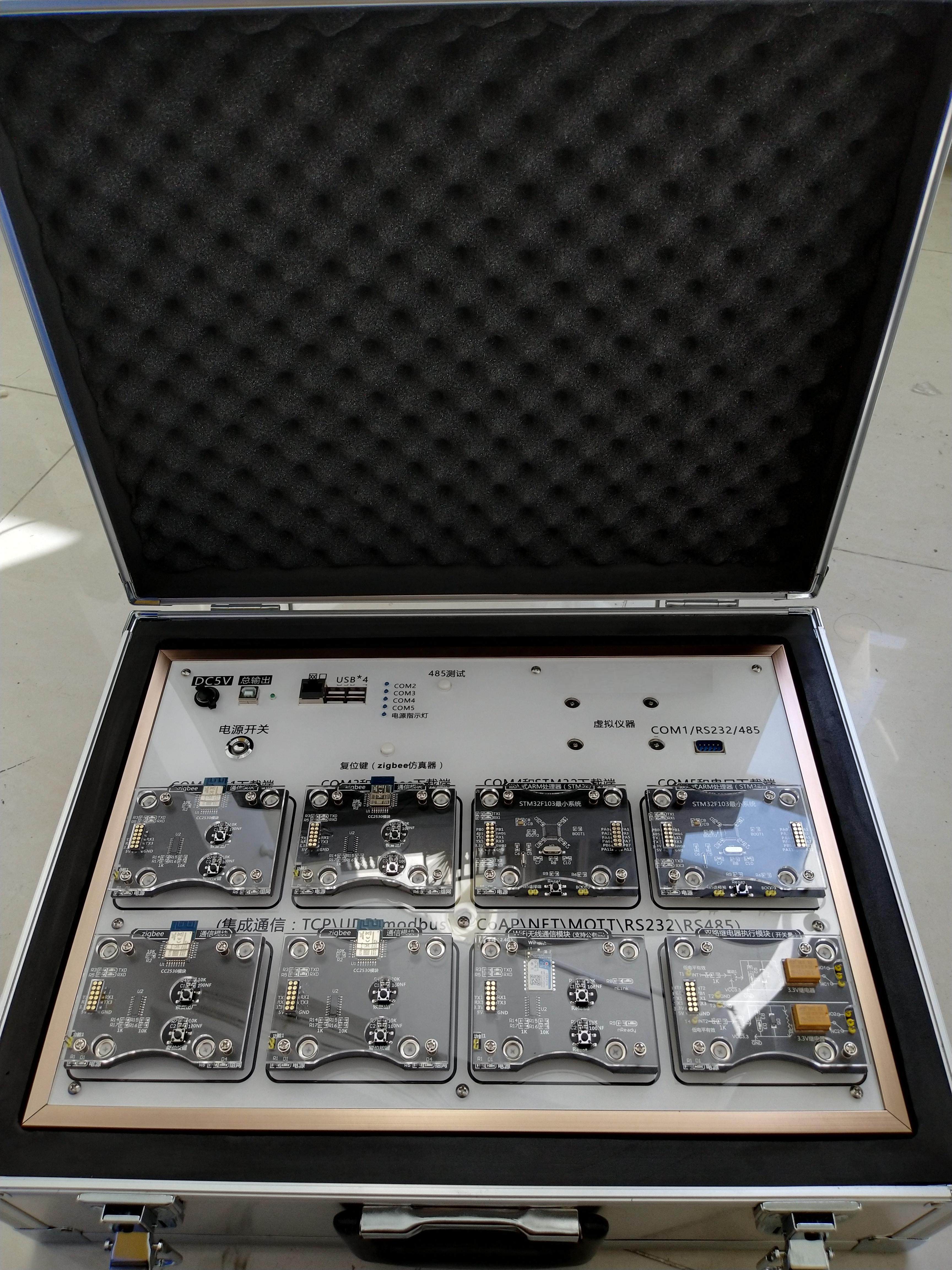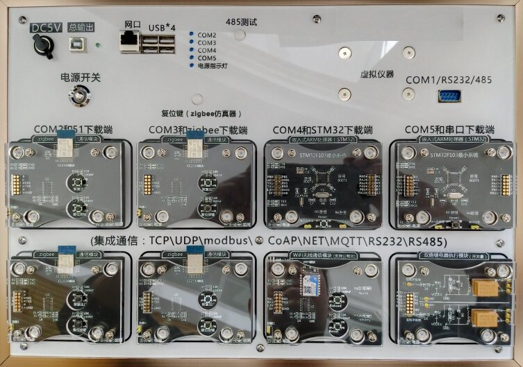 基础实验模块:ZigBee模块(8个)、WIFI模块(1个)、蓝牙4.0模块(2个)、嵌入式网关(Linux/Andriod系统,1个)、STM32单片机模块(4个);