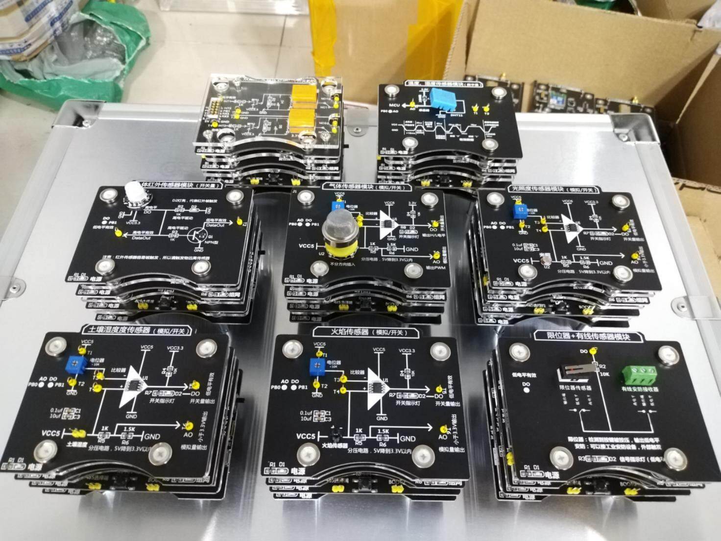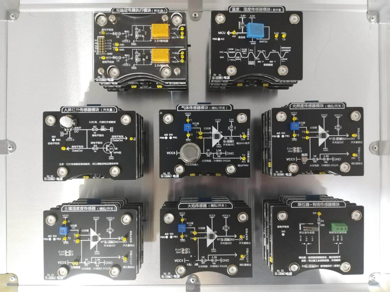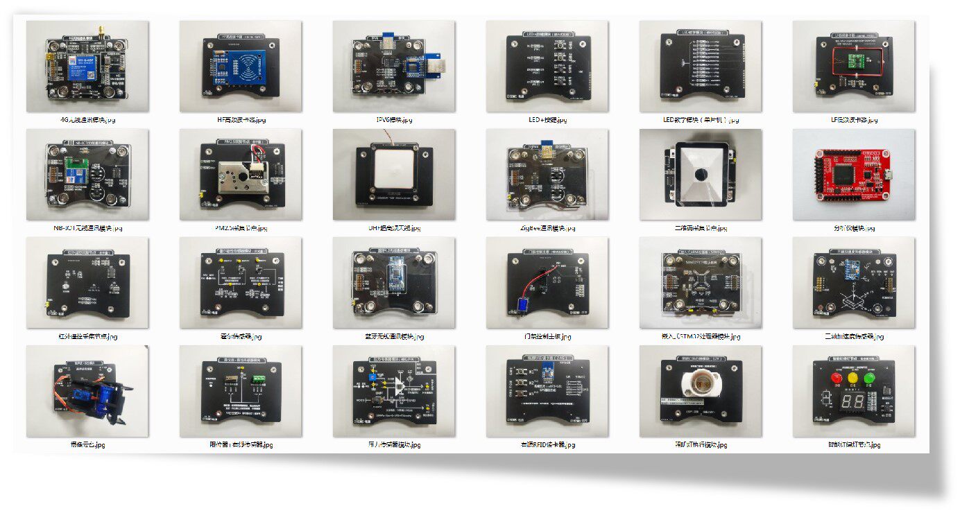 LED按键采集模块、照明灯执行器模块、双路风扇模块、TTL拓展模块、485转接通信板、摄像云台(带摄像头)、红外控制器、GPS定位器、智慧平衡车主板、门禁控制主板、4-20mA工业传感器模块、红绿灯模拟器模块、数码管显示器模块等。