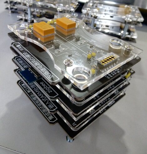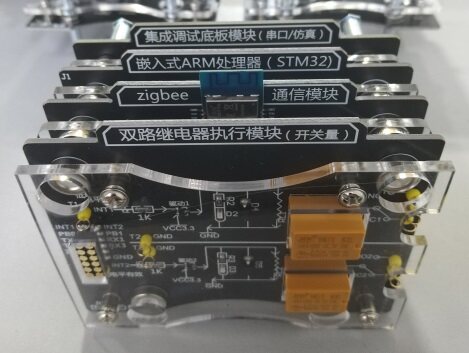 该实验箱所有模块采用磁吸式接口设计及搭积木式架构,采用标准的12路弹性插针,可以实现供电、仿真调试、数据通信、IO口拓展等功能;同时支持搭积木式的多级磁吸连接,无须外接跳线,通过弹性插针即可通信,支持搭积木高度为4层。即:调试底板模块+STM32处理器模块+ZigBee无线通信模块 +传感器/执行器模块(4层垂直积木,无须额外接线),可拓展性极强,如下图所示: